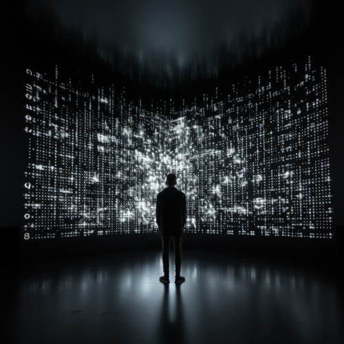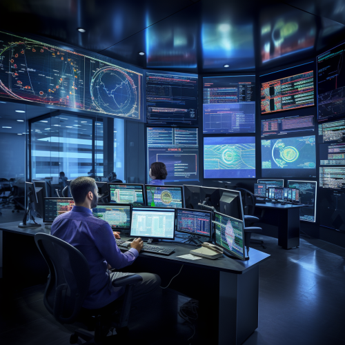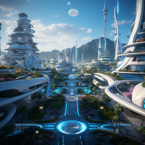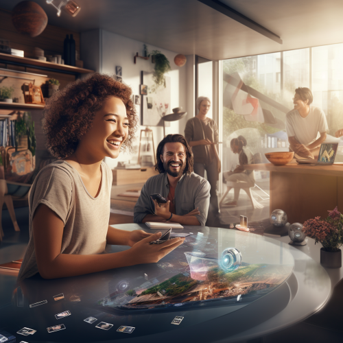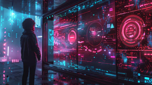 Design a futuristic illustration that represents the integration of AI at 'MultiTeK-Media'. Include visuals of AI algorithms, data flow, and smart devices interacting with users. The scene should evoke innovation and technology, showcasing how AI enhances digital experiences. --ar 16:9 --s 250 --v 6.0