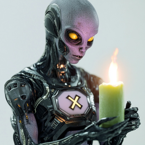 grey alien with purple tint and yellow eyes in high tech body armor with X symbol on chest using a high tech looking device to light a large green candle, hyper realistic, white background