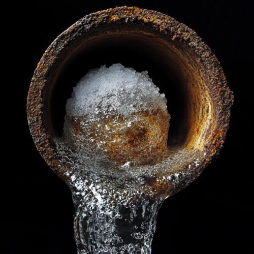 a chemical reaction of sodium bicarbonate (baking soda) and salt (sodium) unclogs a pipe containing a grease ball. High resolution, definition, Sony Alpha camera portrait. Show a cross section of the pipe in the system. Show the u shaped tube of plumbing.