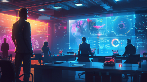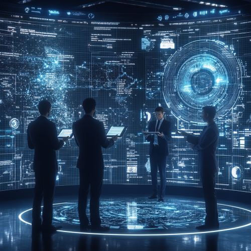 Create a high-quality illustration depicting a technology consultant advising a business team at 'MultiTeK-Media'. Show a modern meeting room with digital screens displaying analytics and strategies. The atmosphere should be professional and forward-thinking, highlighting the importance of tech consulting. --ar 16:9 --s 250 --v 6.0