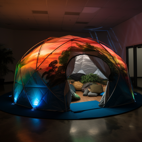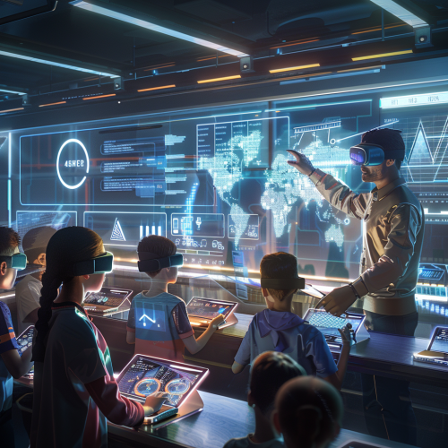 A a video projection Geodesic Dome Hawaiian flag is projected, enveloping the interior, 44 feet wide and 22 feet tall, there are school children aged 5 to 11 in a modern classroom, with a teacher in the center of the room, Inside of the dome modern learning stations. The inside of the dome is made of durable cloth material,