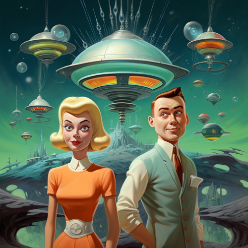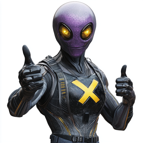 grey alien with purple tint and yellow eyes in high tech body armor with X symbol on chest giving a thumbs up, ufo in white background, in style of matt furie