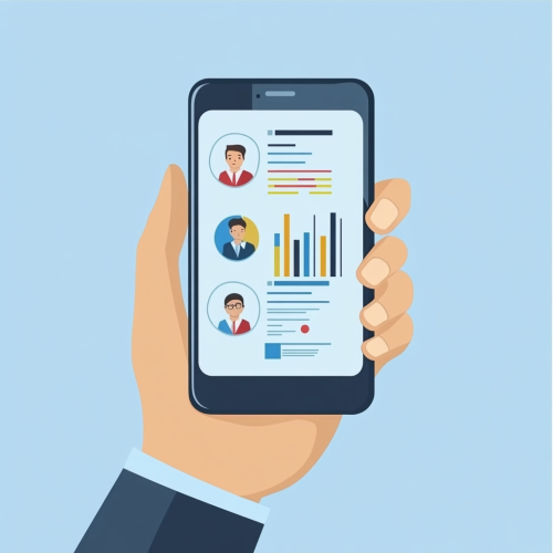 A hand holding smartphone with chart and messages on screen. Good communication with team members or clients. Flat illustration, concept of video conference or online teamwork.