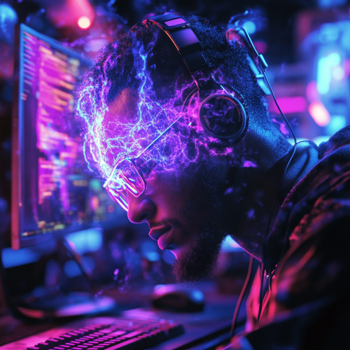 Ultra-realistic gamer, sharply focused on his screen, intense expression, gaming setup glowing in the dark, vibrant neon lights from the monitors. A powerful, electric aura glowing from his head, neon blue and purple hues swirling, indicating heightened brain activity and mental focus, immersive atmosphere. Photorealistic details, cinematic lighting, highly detailed textures –v 6 –ar 9:16 –q 2 –style realism