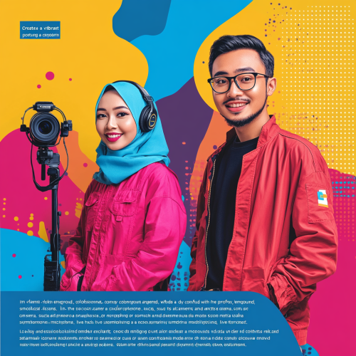 "Create a vibrant and modern post featuring a dynamic, colorful background, with elements that convey energy and engagement. In the foreground, include a professional-looking setup, such as a microphone, camera, or social media icons, symbolizing live hosting. Incorporate a Malay woman wearing a hijab and a Malay man, both in modern, stylish clothing, representing the live hosts. The scene should have a lively and inviting atmosphere, with bright colors and a clean design, leaving space for text to announce 'Looking for a Live Host.' The background can include subtle tech elements or abstract shapes, making the design fresh and engaging." --s 250