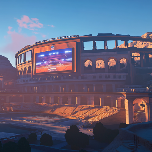 extra large modern camper pods, rectangular in shape, made of glass and steel, interior is a man cave, Pittsburg Steelers themed, large tv, bar, couch, colored lights, large wrap around porch deck outside, electronic scoreboard outside displaying achievements, sitting on hillside, surrounded by maple trees, elm trees, walk ways made of white brick, early evening, stylized,rendered in style of Fortnite, - - ar 3:1