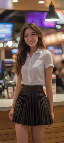 Japanese woman, 20yo,, smiling, Taco Bell employee, beautiful combed hair, white shirt and black pleated mini skirt, skirt length 35cm above the knee, background is Taco Bell cashier, quads, professional photographer with high-performance camera, --ar 9:20 --q 2 --v 6.1