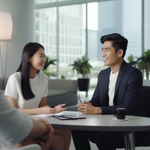 young asian lady interviewing young male in bright modern office. ar-- 2:3 q-- 2