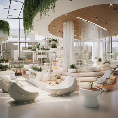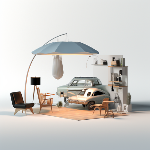 a background picture with items in 3D in the left side and bottom: chair, modular house, car port, lamp, white background, v 5.1