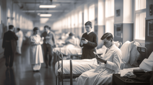 a black and white photo of a doctors in the 1900s using an iphone in a busy influenza ward with patients in the background --ar 16:9