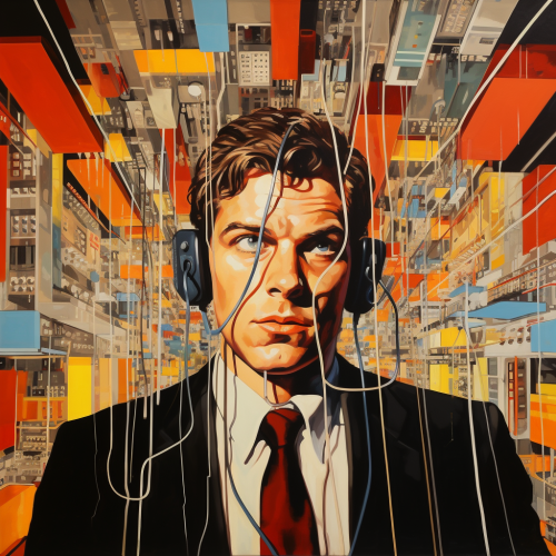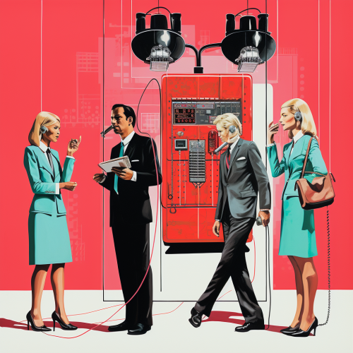 people talking through enormous walky talky device, wearing suites, modern pop art