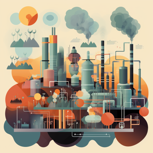 Illustration 7 - Carbon Capture Techniques (Cubism): A cubist-style portrayal of various CO2 capture techniques. Geometric shapes represent different methods. The artwork has a fragmented, multidimensional appearance.