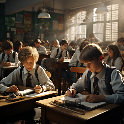 Children at the age of 10 sit in a normal school classroom around tables arranged in a circle and engage in work with computers, realistic photography, many details, bright lighting, daylight, white color --upbeta --s 250 --v 5.2