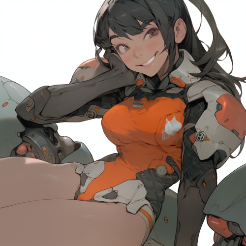 A cute anime girl sitting inside a battle mech dressed in a tank top tight suit smiling in the camera --niji 5 --style expressive --s 250