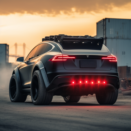 a gas powered, dual exhaust, lifted tesla SUV, ultra extreme, putting out a ton of black exhaust, Elon Musk driving, highly detailed, ultra high quality, ultra high resolution --v 5.2