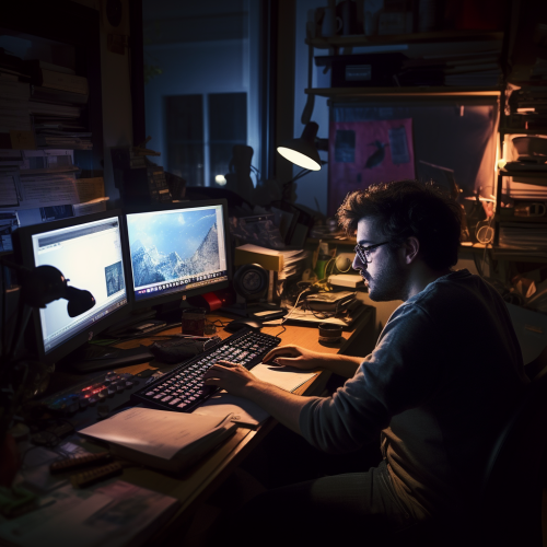"Create a high-quality illustration depicting a vibrant digital workspace for 'MultiTeK-Media'. Include elements like a designer at a computer, digital art on screens, and various graphic design tools scattered around. The scene should convey creativity and innovation, with a modern aesthetic and a bright color palette. --ar 16:9 --s 250 --v 6.0