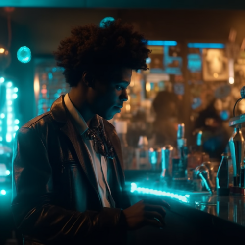 young black guy with an afro wearing futuristic clothes in a futuristic 1920's bar ripping cyborgs robotic jaw off, 35mm, hyperealistic, roger deakins, neon, surrounded by cyborgs --v 5.0 --s 750