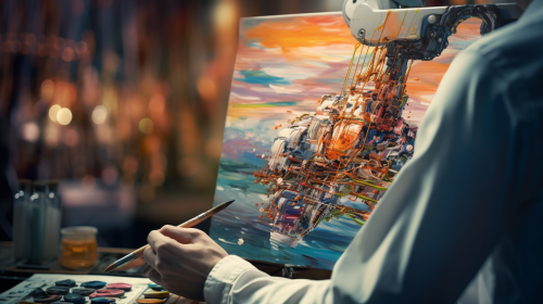 Futuristic Robot Creating Art in Studio. As the robot's hands move with precision and speed over the canvas, apply an intense motion blur effect to them, capturing a sense of rapid movement and the fluidity of its artistic endeavor. The blurred hands should starkly contrast with the clarity of the rest of the scene, highlighting the robot's swift artistry. --ar 16:9