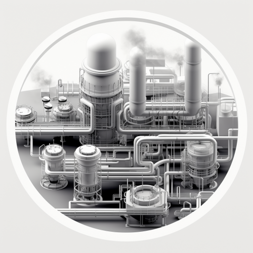 A minimalistic black-and-white vectorized icon of a geothermal power plant encapsulated within a circle:: Geothermal wells, steam, and turbines as key elements of the design:: Highly recognizable and easily distinguishable at small sizes:: Minimalistic and clean design, with emphasis on the key characteristics of geothermal power production but with no chimneys:: Black-and-white color scheme to enhance clarity and simplicity:: Concise and precise lines to represent the geothermal wells, steam, and turbines:: Circular shape to encapsulate the icon:: --ar 1:1