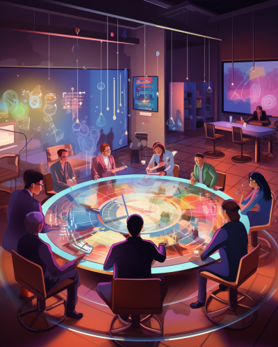 Conferencing, Clicks, and Chuckles: The Lighter Side of Serious Business Talk!, Meetings, Symposia, Discussions, Dialogues, Webinars dusk, Boardroom, Projector, Laughter, Business Attire, Slideshow, Engaging, Lighthearted, Playful, Enthusiastic, Relaxing Cotton, Render Engine, Zoom Lens, High-definition, Pixelation, Resolution --stylize 547 --v 5.0