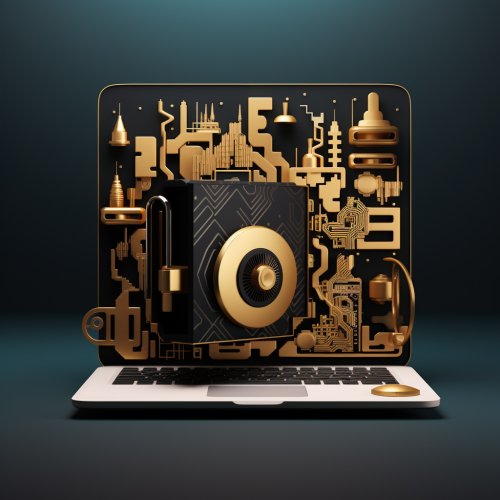 a 3d paper cut out illustration of a closed lock and an computer in black and gold --ar 1:1