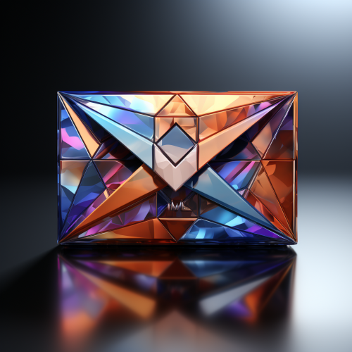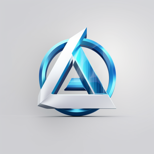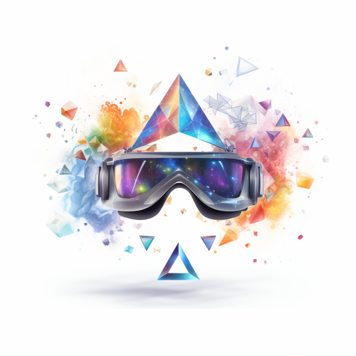create an eye-catching logo on a white background, showcasing a sleek virtual reality headset, with the right and left lenses acting as windows, reflecting a unique world of floating geometric shapes, symbolizing the infinite explorations within augmented reality. Positioned behind the headset is a constellation of interconnected triangles forming a Merkaba, symbol of ascension and interdimensional travel, rendered in elegant black and gold, creating a sophisticated contrast and symbolizing timeless elegance and value. A frontal view with a broad lens distinctly illuminates the intricate Merkaba and the dynamic reflections in the lenses. The design concludes with delicate glows, nuanced reflections on the lenses, and soft shadows, blending the innovative and the eternal gracefully. --ar 1:1