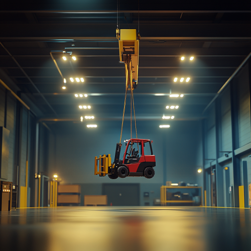 an ultra realistic picture of a yellow overhead cabined crane lifting with nylon slings a red forklift in the air inside a well illuminated shop floor and focusing the Crane
