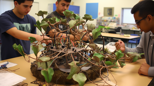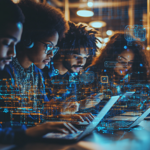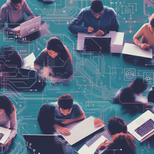 An eye-catching, high-quality image that depicts a diverse group of individuals engaging with digital devices, such as laptops and tablets. They are in a modern, collaborative workspace, symbolizing a community of learners and innovators. Overlay subtle AI elements or graphics, such as digital circuit patterns or AI icons, to emphasize the tech-driven nature of the platform.