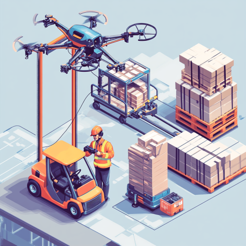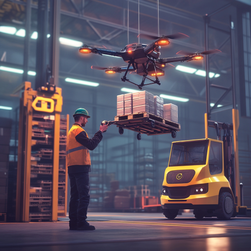 An engineer is shaking a physical joystick with a hinge. There is a pallet truck carrying goods on the lifting platform connected to the joystick, and there is a large cargo fixed-wing drone on the top of the lifting platform;