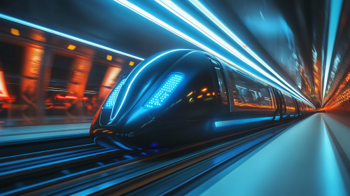 A futuristic train, Futuristic travel at the speed of light Time travel with super fast speed, Modern Electric train Sustainable and Stylish Transportation SolutionsxA, blue ones --ar 16:9