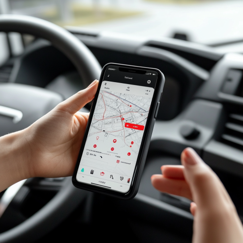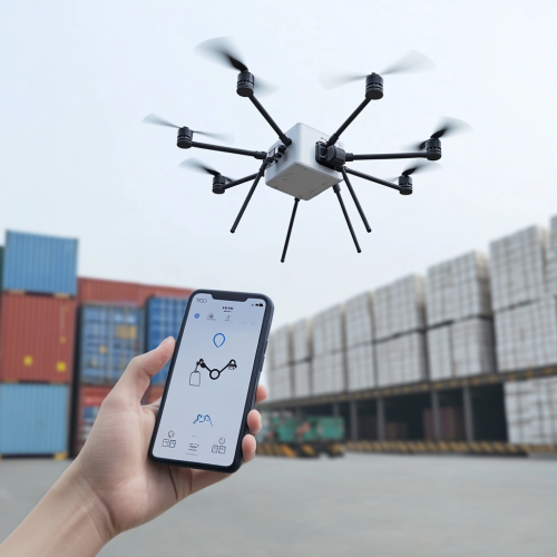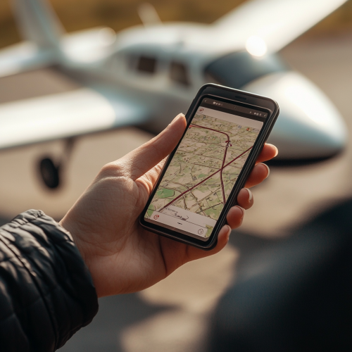 A person is holding a smartphone and controlling a small airplane not far away, through the phone’s navigation app, with the screen displaying the route the airplane is about to fly