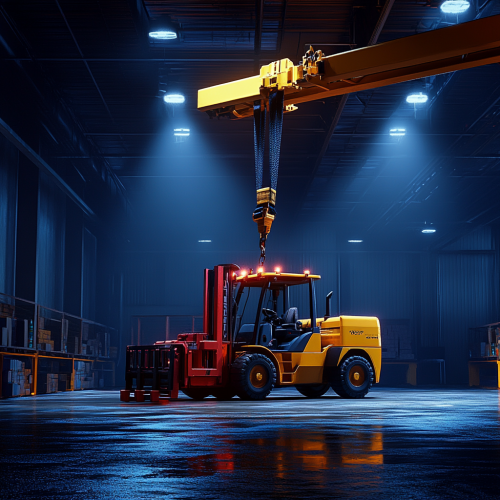 an ultra realistic picture of a yellow overhead cabined crane lifting with nylon slings a red forklift inside a well illuminated shop floor and focusing the Crane