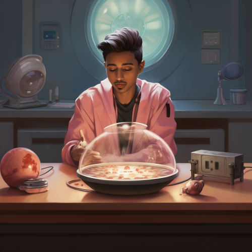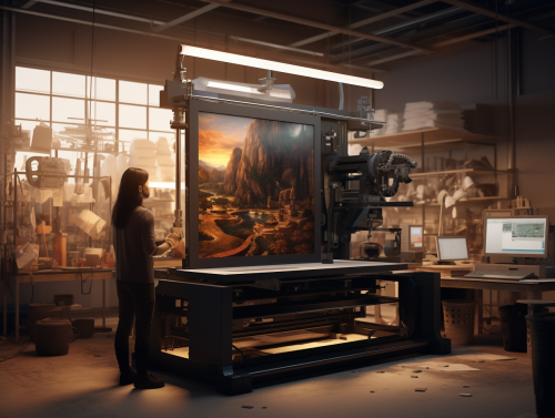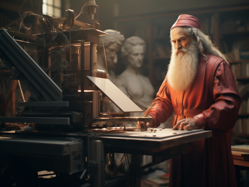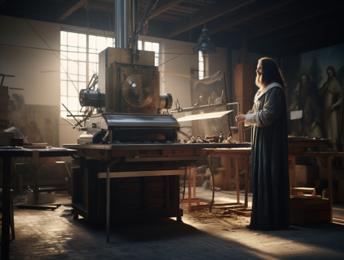 Atmosphere in the art studio, Leonardo da Vinci is standing and looking at the 3D Printing machine , unreal engine 5, 4K, hyper realistic --v 5.2 --style raw --ar 4:3
