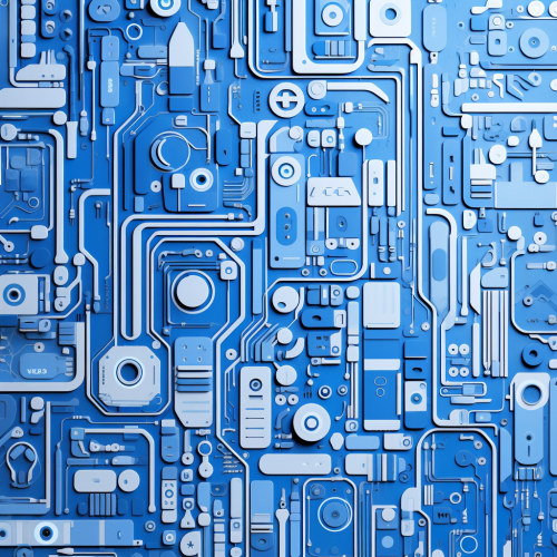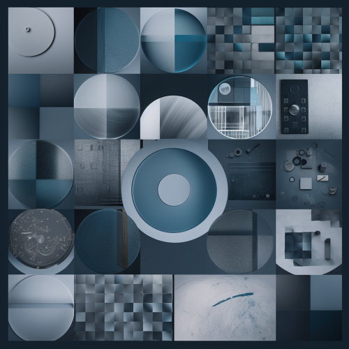 very few big rectangles, very few big squares, very few big circles, no small shapes, similar sizes, smooth borders, on circular mood board, blue highlights, gray background, technology, UX, innovation, geometric shapes, speed lines, luxury, sophistication --v 5.0