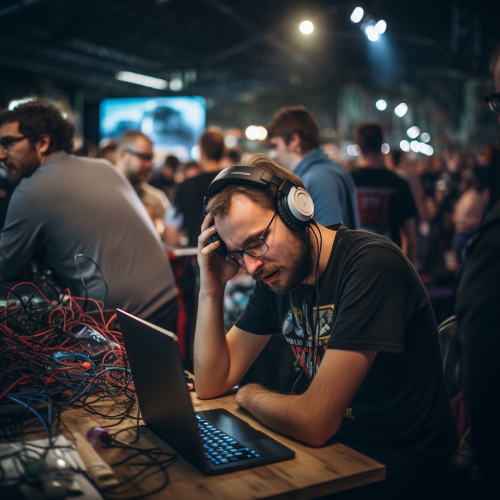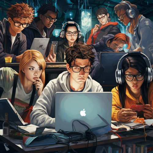 Geek party with alcohol, computers, Japanese style. in an amphitheater-type university class. dangerous, frantic, realistic looking, bad people faces