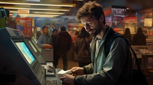 a dystomic future, a man pays at the checkout in a shop with his digital identity and his digital wallet, ultra poreal, ultra detailed, intricate details, day light source,Hyper - realistic textures,--v 5,--testp --ar 16:9