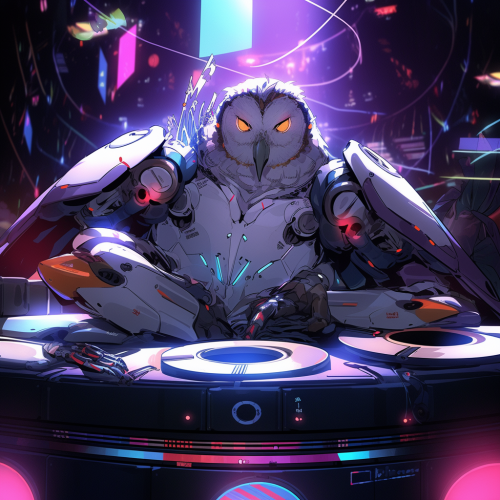 cyborg cyberpunk machine owl resting, disco ball stomach, illystration poses, POV --niji 5 --seed 3930226115