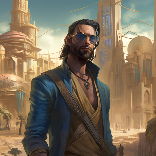 Mayor of a Desert City, Fantasy, Cyberpunk, in his 30's, Brass and Glass --v 5.0 --s 250