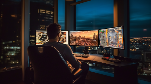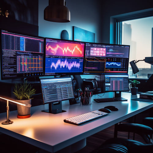 Digital workstation setup with multiple screens displaying graphs, content drafts, and tools, emphasizing content creation.