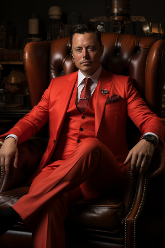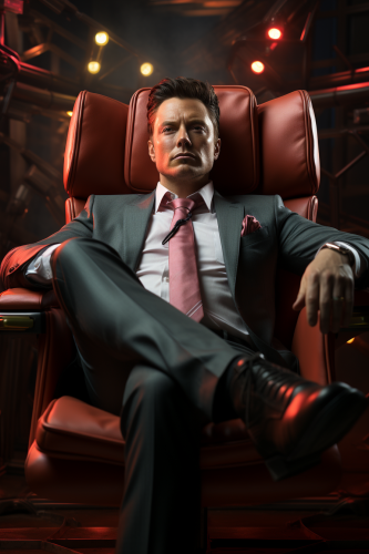 Elon Musk seated in a visually striking setting that combines elements of SpaceX and Tesla. Musk should be sitting in a prominent position, and there should be clear signage or signboards displaying the names 'SpaceX' and 'Tesla' behind him. The image should capture the essence of Musk's leadership in both companies and convey the innovative spirit and technological prowess associated with these organizations, Hyper Realistic, HD, --ar 2:3 --s 750