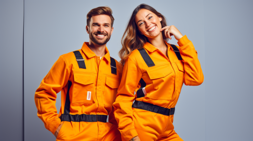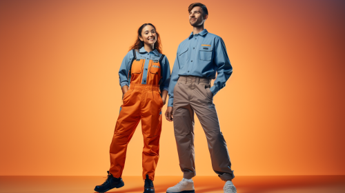 Full - body view of a couple of engineering solar panel students posing like the boss, smiling, wearing high tech work outfits, looking cool, having fun, on a bright orange studio background, engineer chic, fashionable, style fashion photo, colorfull, sunset lighting, highly detailed, highly contrast, 4k, hyper realistic portrait photography, Kodak Portra 800, cinematic lighting, --ar 16:9