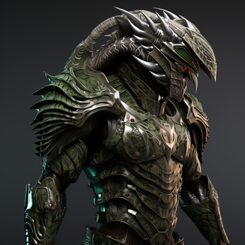 This warrior, enveloped in a sophisticated, futuristic armor, wears a helmet shaped like a crocodile, exhibiting barbaric elegance with detailed green scales and sharp teeth, and the eyes of the helmet gleam like lasers. The full-body armor, reminiscent of a StarCraft Marine, is comprised of technologically advanced panels and reinforced joints, offering the warrior supreme protection and agility. His rifle is designed with a focus on maximizing combat efficiency. It sports a rugged, intricate appearance, and its barrel radiates a formidable energy. This weapon, aggressive yet refined, complements the stern and ferocious image of the warrior. --v 5.2