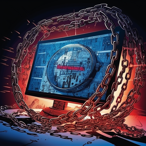 L'illustration montre un écran d'ordinateur affichant un message d'erreur avec des chaînes brisées et des chaînes rouges et bleues entremêlées, symbolisant la censure et les restrictions de l'accès à l'Internet en Corée du Nord.