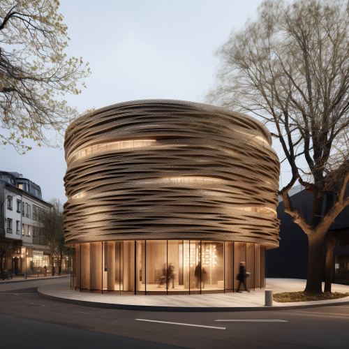 rchitect kengo kuma facade; round livehouse in tokyo; frontal view; helix rotating wrapping facade in material wood and stone