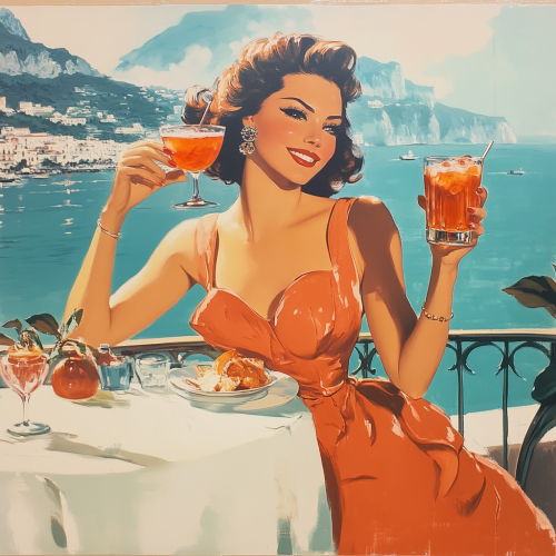 a woman in the style of 1950s fashion dining at cafe on the italian riviera in amalfi, she is drinking aperol spritz, the background should be plain beige