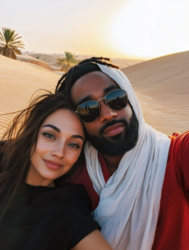 a selfie of a beautiful model face young African American man, with his Lebanese wife, and 4 year daughter. The daughter has green eyes. The wife looks like Nancy Ajram. The location is the desert of Dubai during the sunset. We can see the dunes in the background and a little oasis with palm trees. The African American man is wearing sunglasses, and red baggy t shirt, and a white scarf covering his head, he also got dreadlocks, took from iPhone 16, in 2024 in the style of Alex Webb, candid::3 30mm lens, shot in 2024, candid, minimalism, moody, modern, cinematic realism, Eye Level Shot, shot with hasselblad 30mm, Kodak Ektar 100::1 --no black and white photography --ar 3:4 --style raw --stylize 0 --q 2