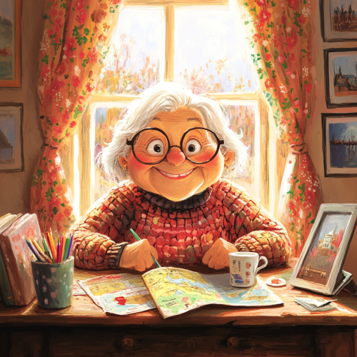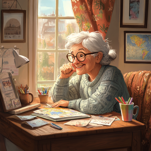 An illustration of a cheerful, elderly woman sitting at a cozy wooden desk by a sunny window, with a joyful, adventurous expression on her face. She’s wearing big, round glasses and a cozy sweater, and she’s surrounded by items symbolizing retirement hobbies and adventures: a map, travel brochures, a small stack of books, a cup of coffee, and colorful pens. The room has a warm and inviting atmosphere, with soft sunlight streaming in, floral curtains, and framed pictures on the wall hinting at past adventures and future dreams. The book cover has a whimsical and humorous feel, perfect for a retirement activity book. Text areas at the top for a title like '101 Fun Things to Do in Retirement' and a subtitle at the bottom.