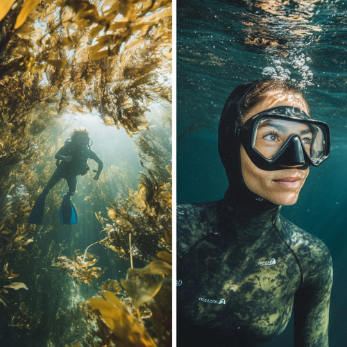 generate a full page sales ad for a cold water diving wetsuit with pictures of a chilean woman wearing the wetsuit on the surface and scuba diving underwater in a kelp forest off chile