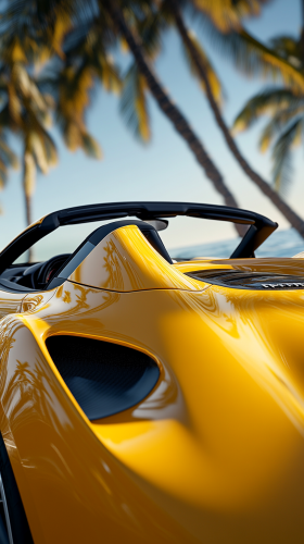 A close-up of a striking yellow Ferrari F8 Spider, captured from above, highlighting the sleek contours of the car’s body and the soft curves of the convertible roof. The shiny surface reflects the clear blue sky, enhancing the vibrant color. The background features the blurred outlines of palm trees, suggesting a luxurious coastal drive. Ultra-detailed, photorealistic with coastal backdrop, 8K resolution --ar 9:16 --v 6.1 --style raw