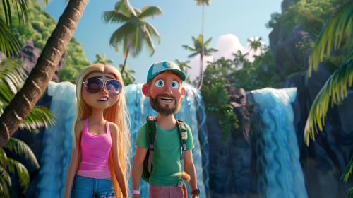 A couple on a tropical island vacation, Pixar-style, animated realism, the boy with a short beard, backward cap, green t-shirt, and a relaxed smile; the girl with long blonde hair, sparkling blue eyes, pink t-shirt, and sunglasses. They’re posing in front of a massive waterfall surrounded by lush palm trees, bright blue sky in the background, soft shadows. --ar 16:9 --v 6.0